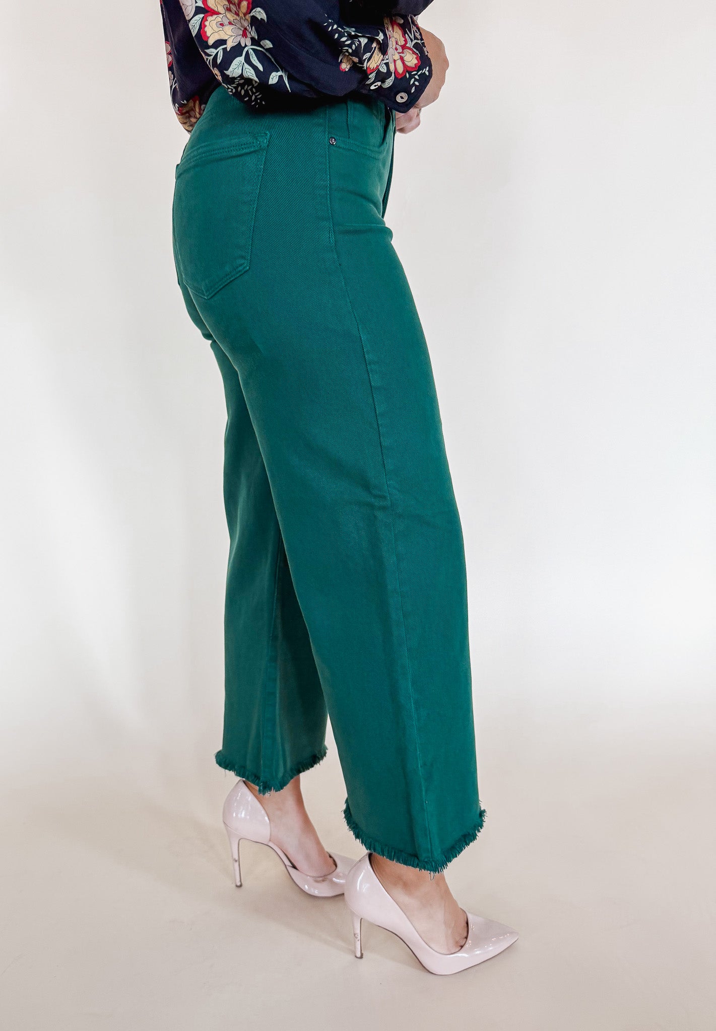 Tummy control, high rise, raw hem, cropped jeans. A beautiful green color, perfect for pairing with a blouse or sweater for Fall.