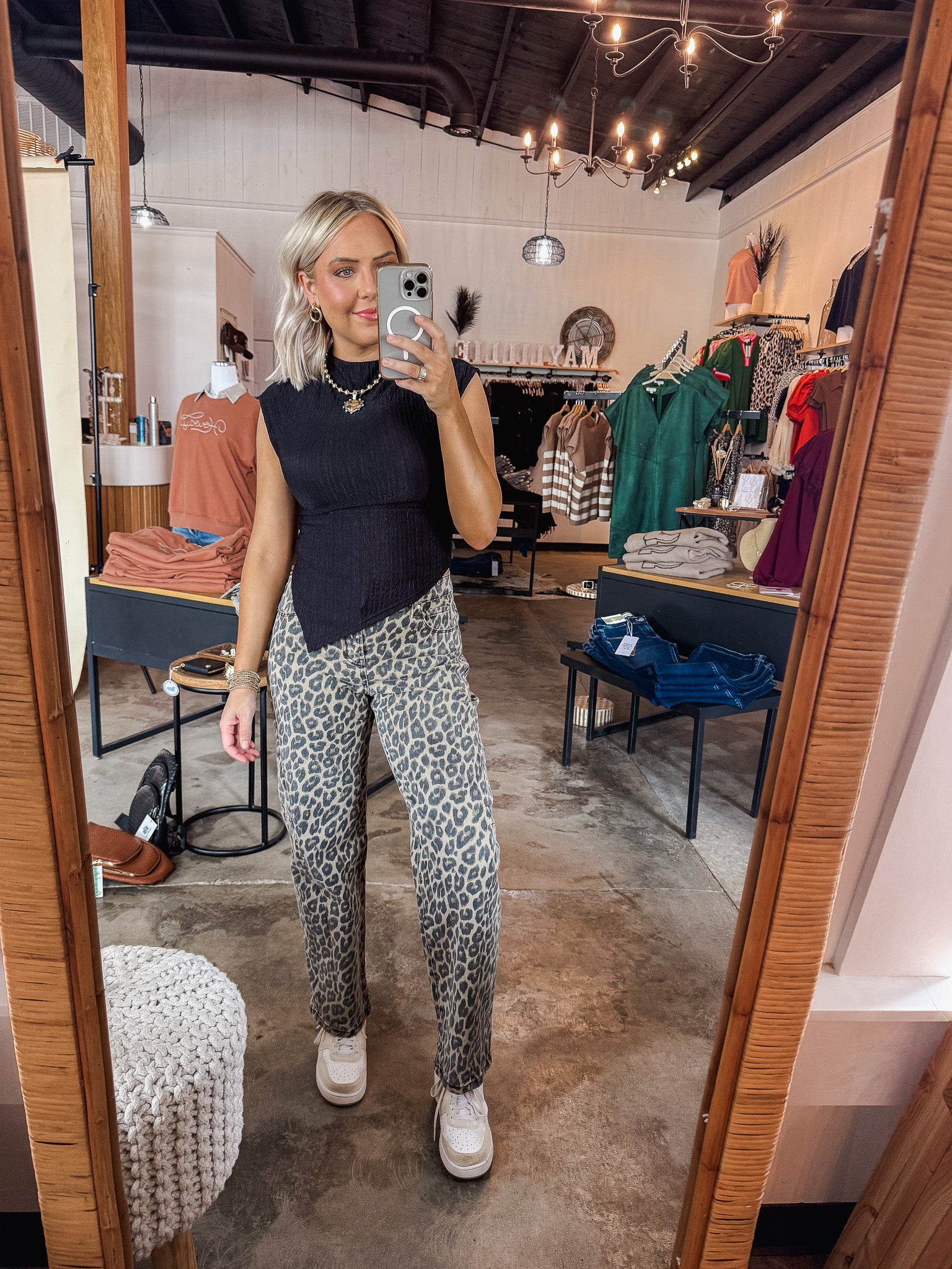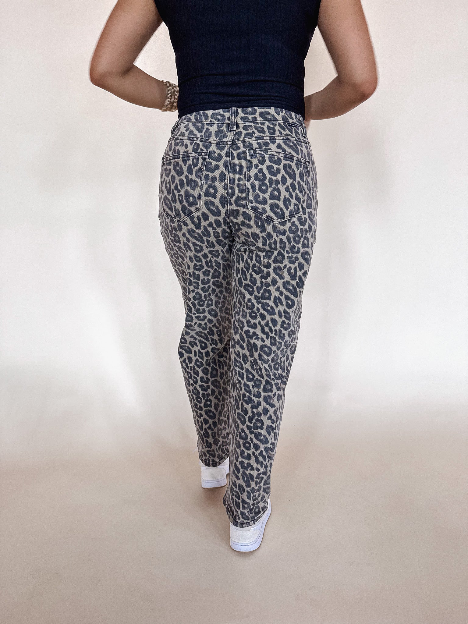 Leopard jeans with a slight barrel leg. Mid Rise. Ankle length. Cuff the bottoms and wear with sneakers for a casual fit, or leave as is and pair with booties for a dressier look.