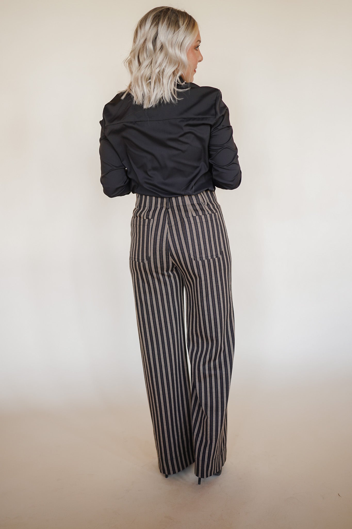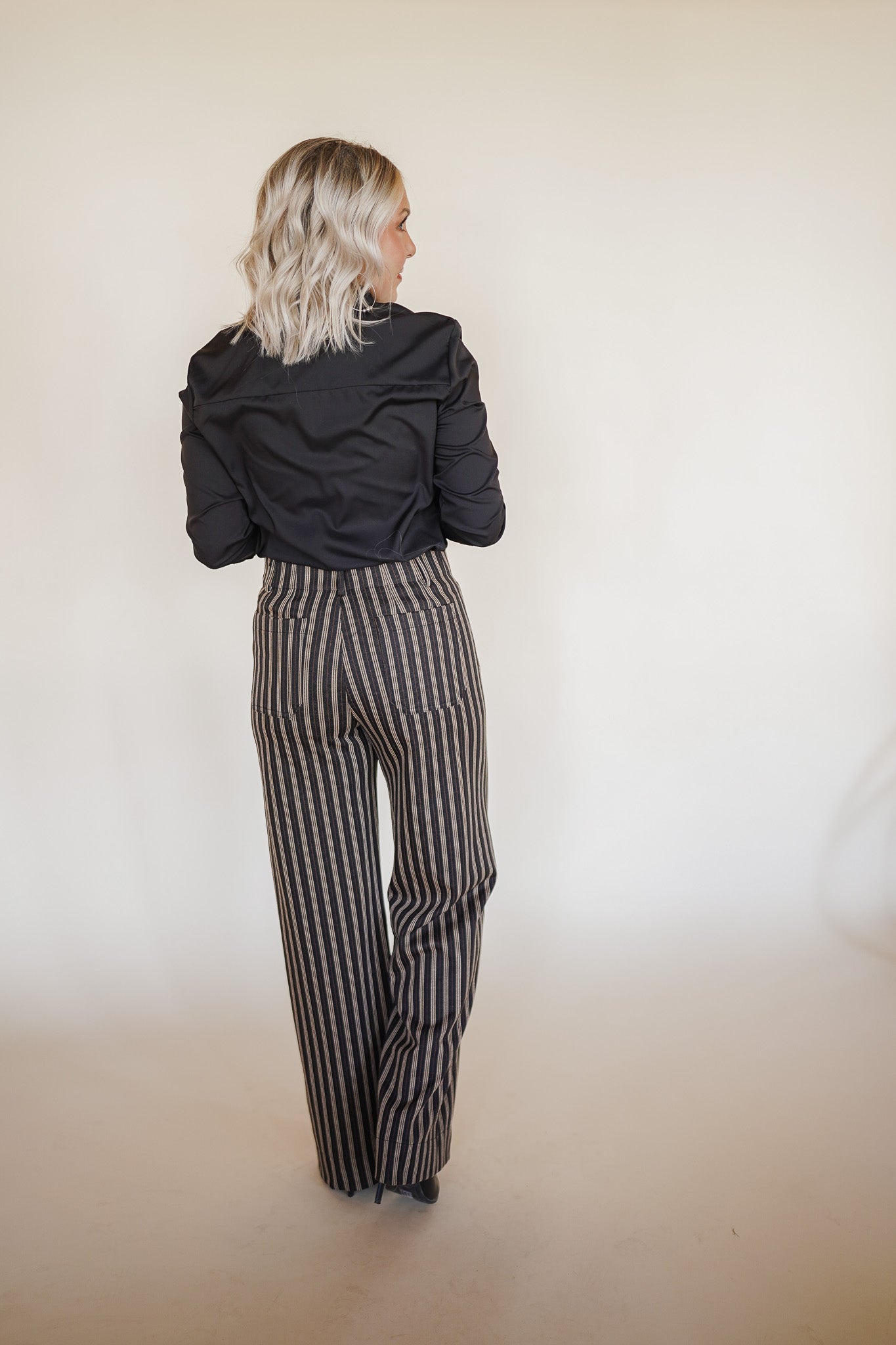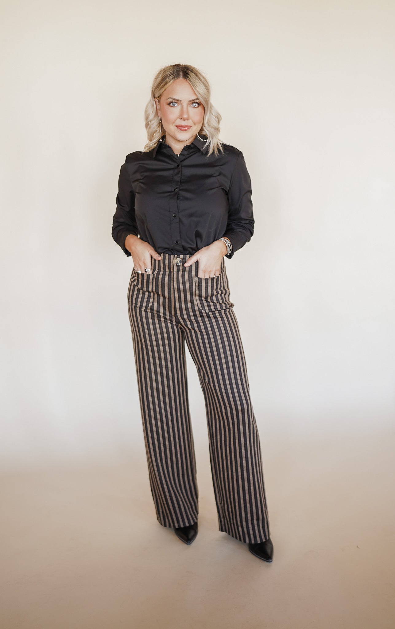 Striped trouser pants with front and back pockets. Super comfortable, high rise, and stretchy! They aren’t as stretchy through the waist, so size up if between sizes.