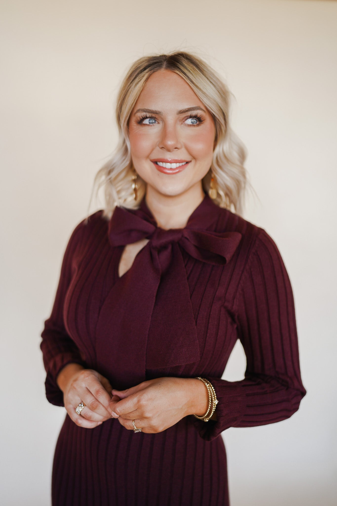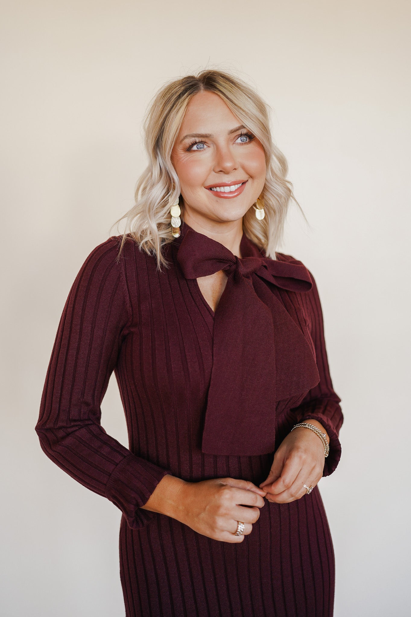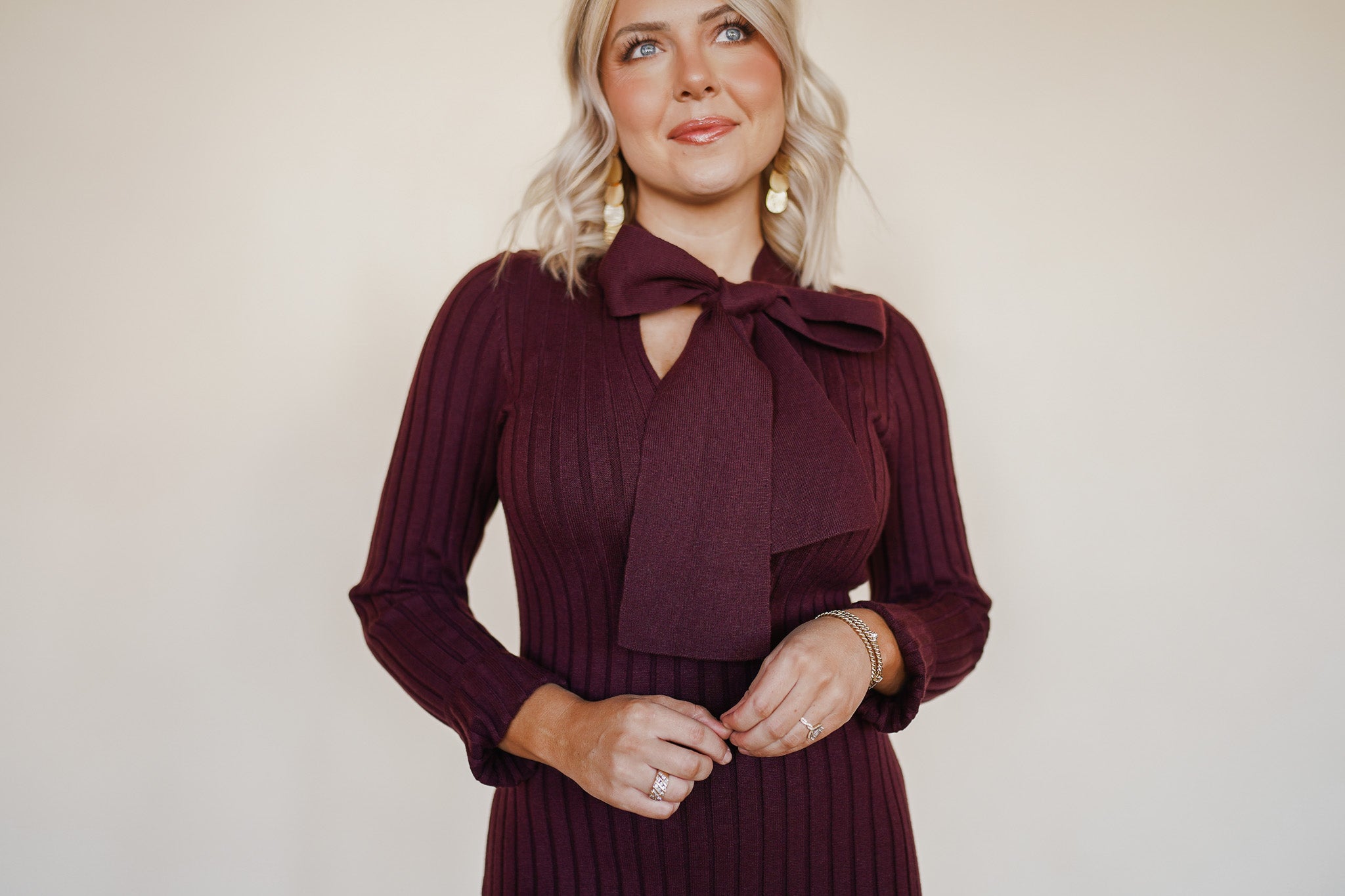 The most gorgeous and flattering sweater dress!! The quality of fabric is unmatched, making this feel and fit like a designer brand. The bow on the neckline is the perfect touch giving this dress so much character.