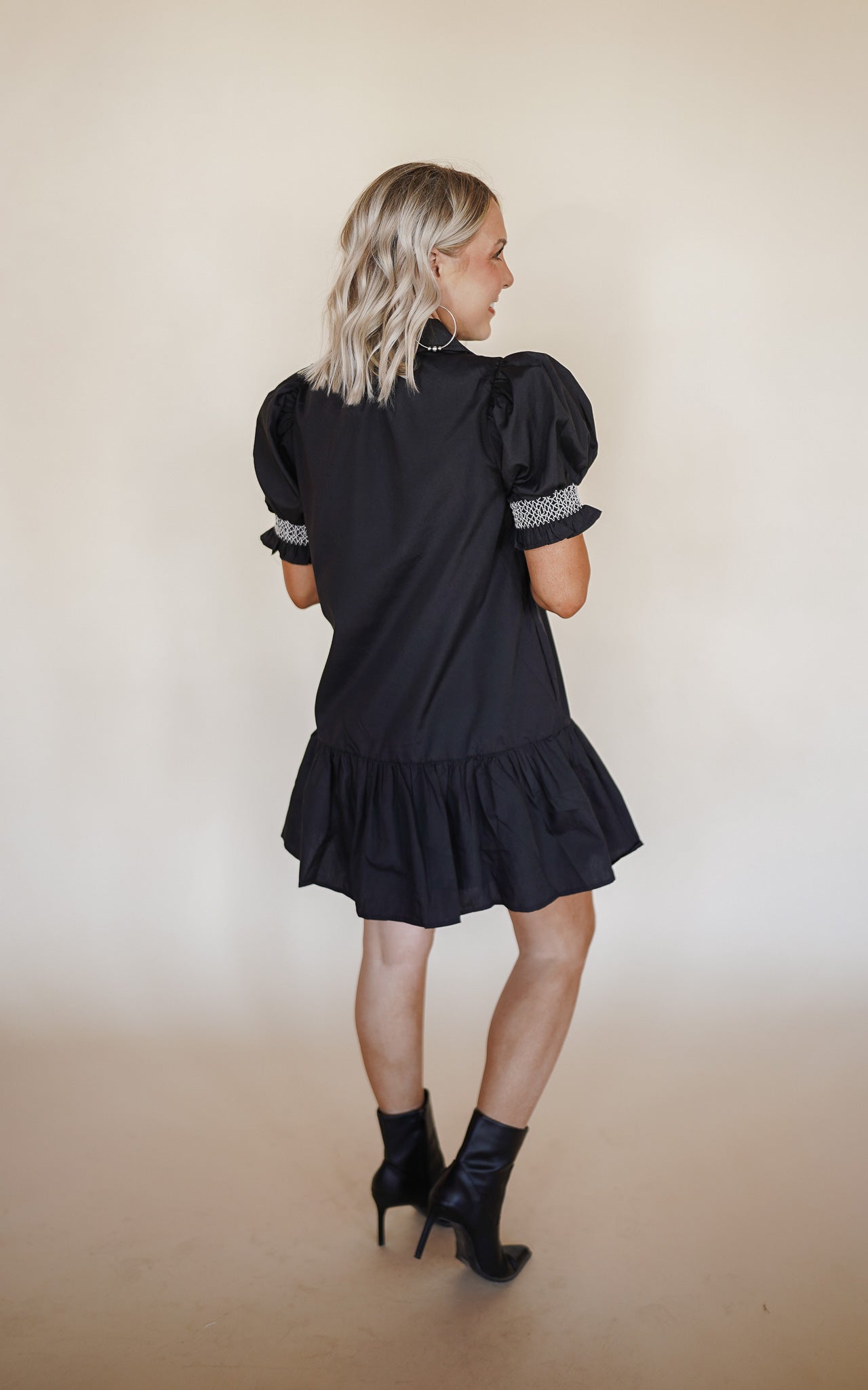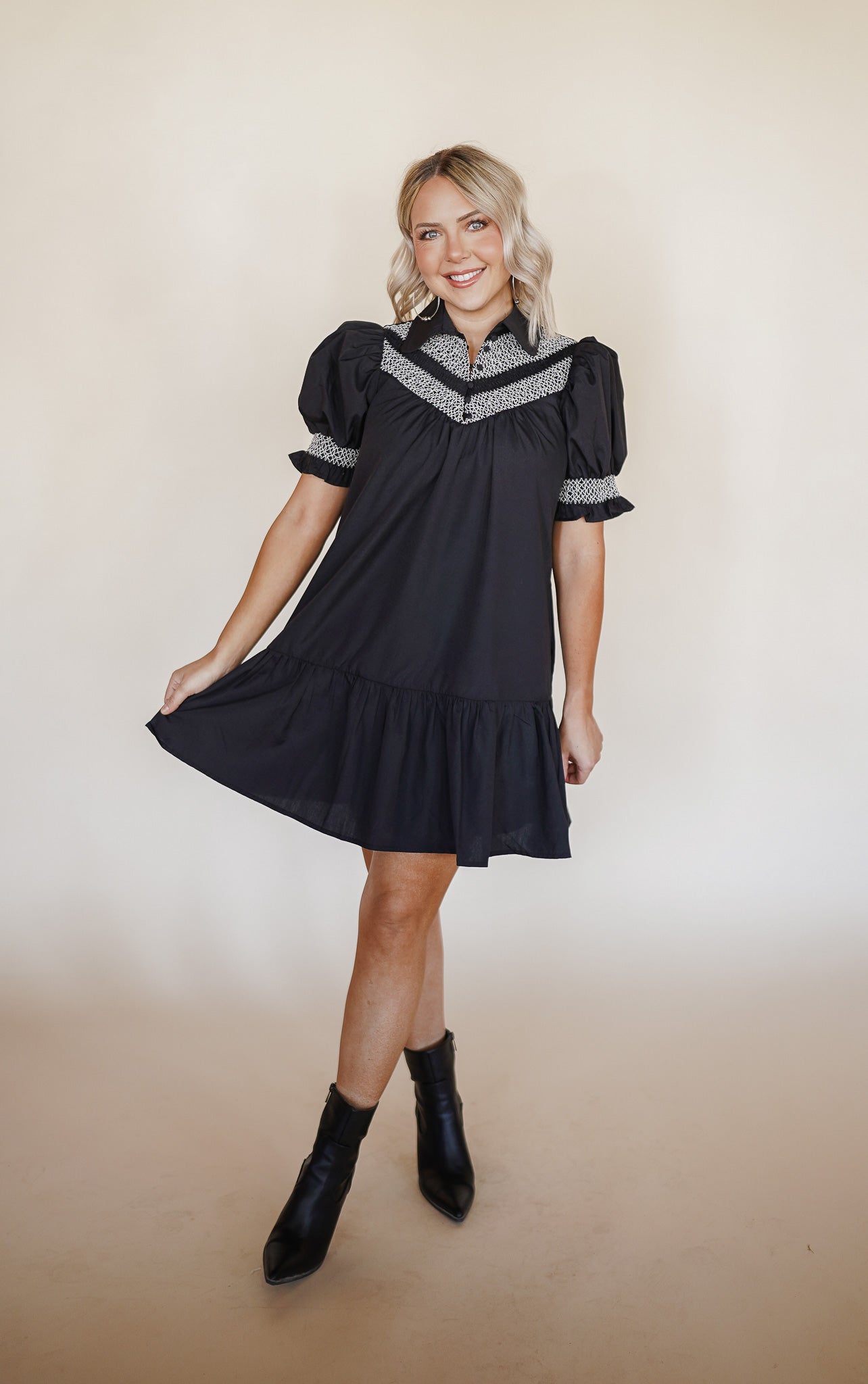 Solid embroidered smocked cuff short sleeve mini dress featuring embroidered smocked yoke. Collar button front closure. Pockets at sides. Lined. Woven. Non-sheer. Lightweight.
