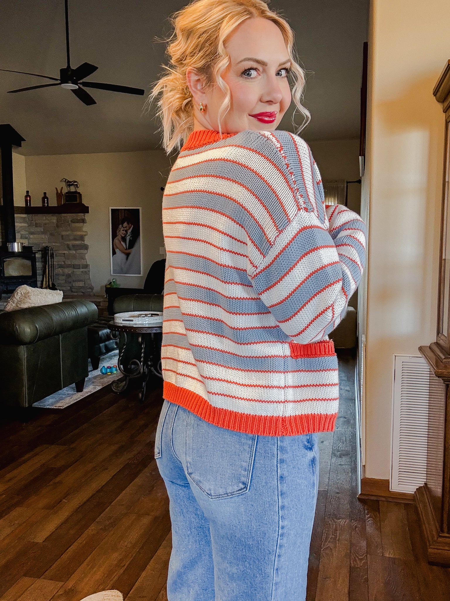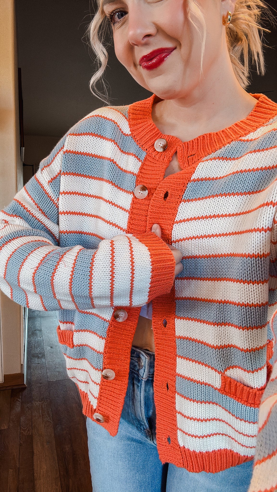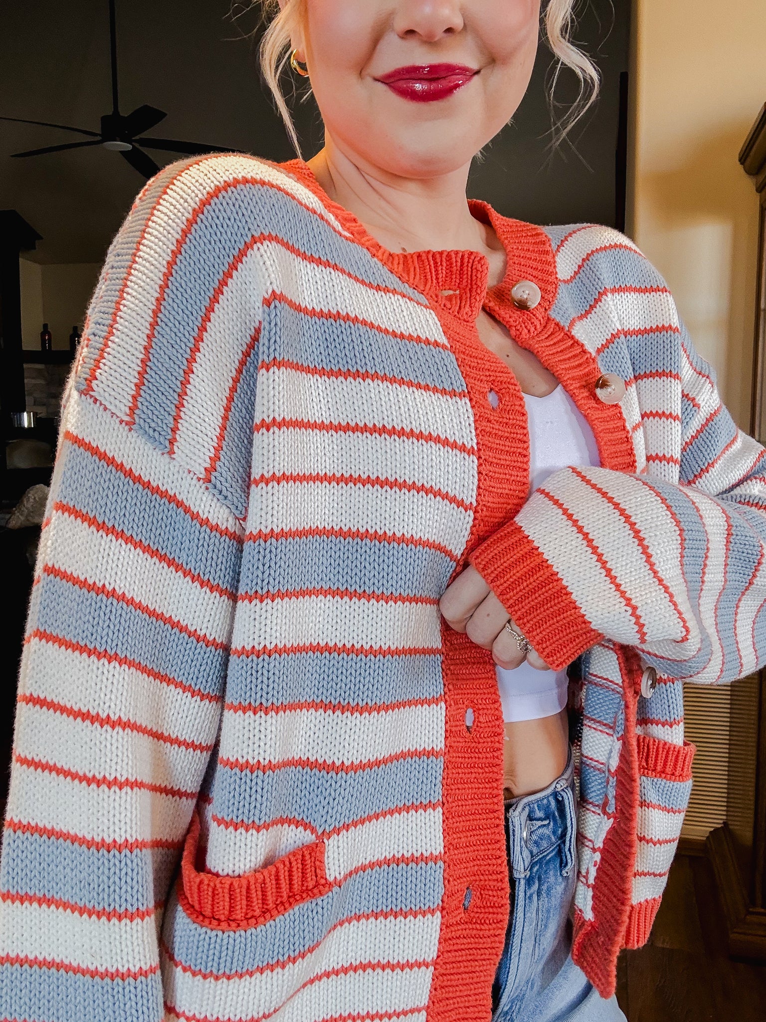 Striped, button up sweater cardigan with functional buttons. A great layering  piece for Spring and early Summer!
