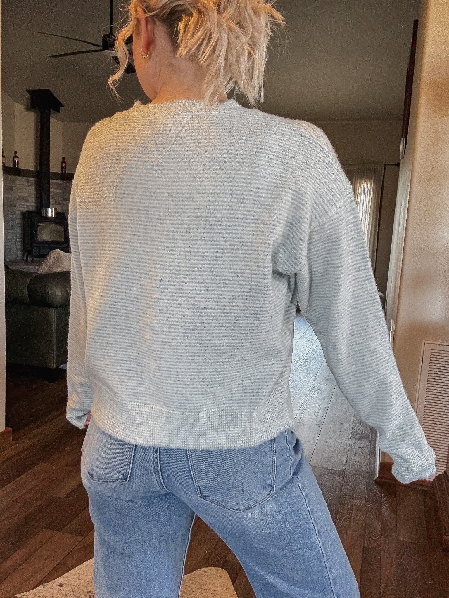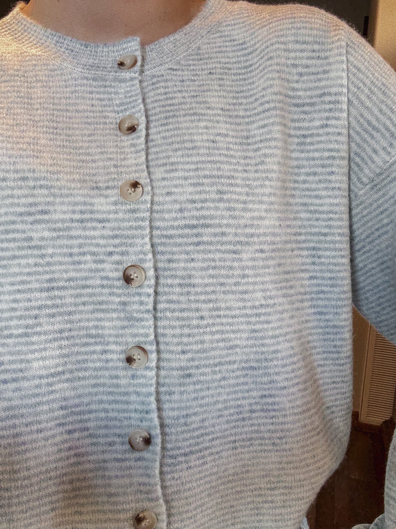 Small striped cardigan in mint. Such a pretty color for Spring! The material is so soft and luxurious.