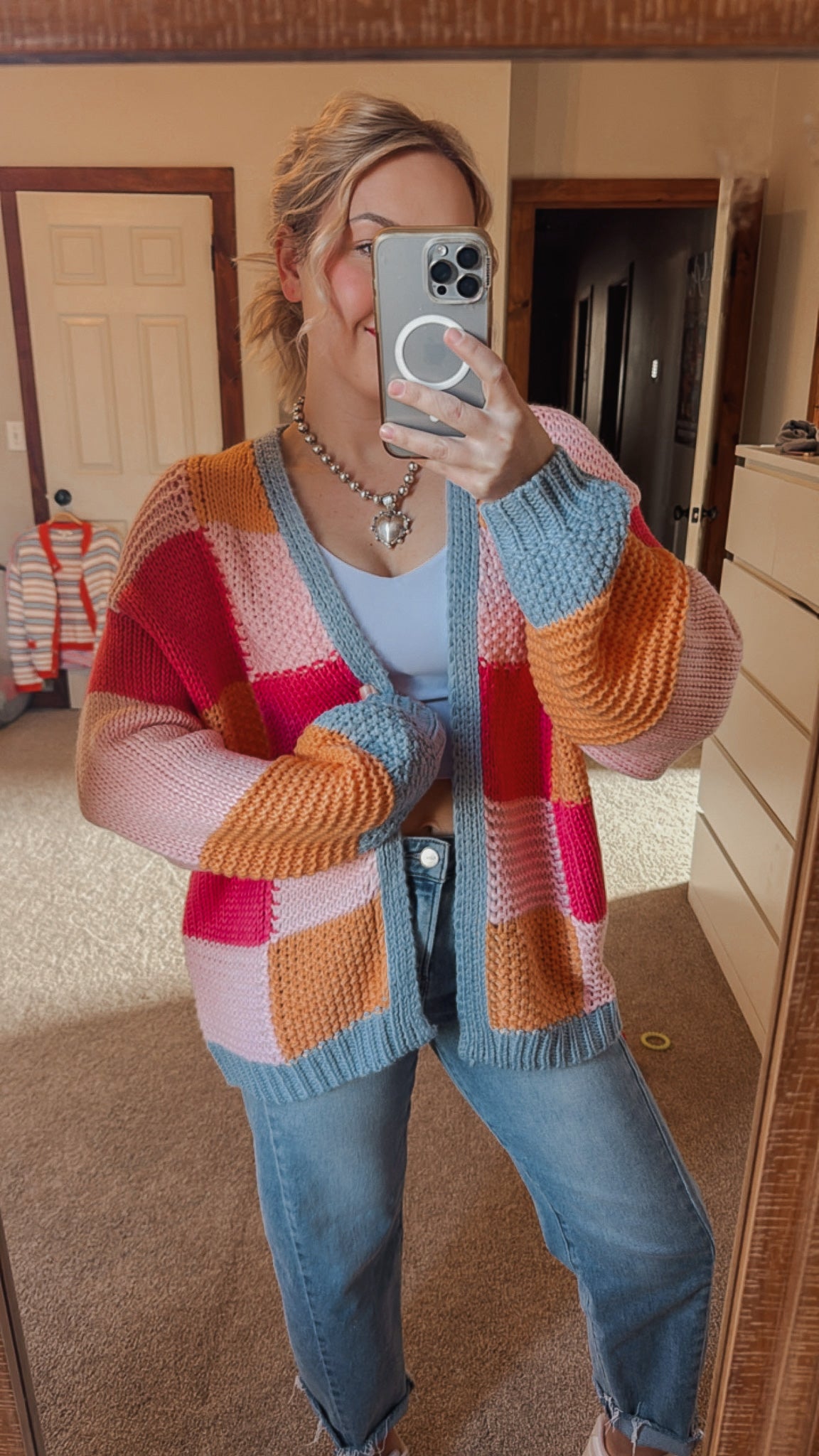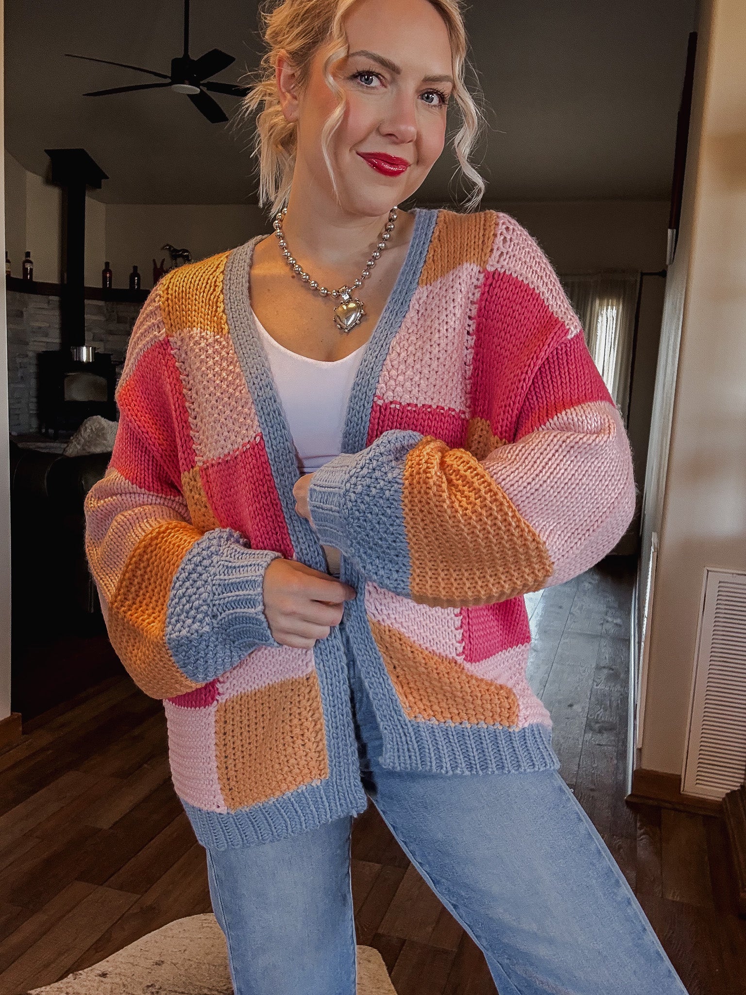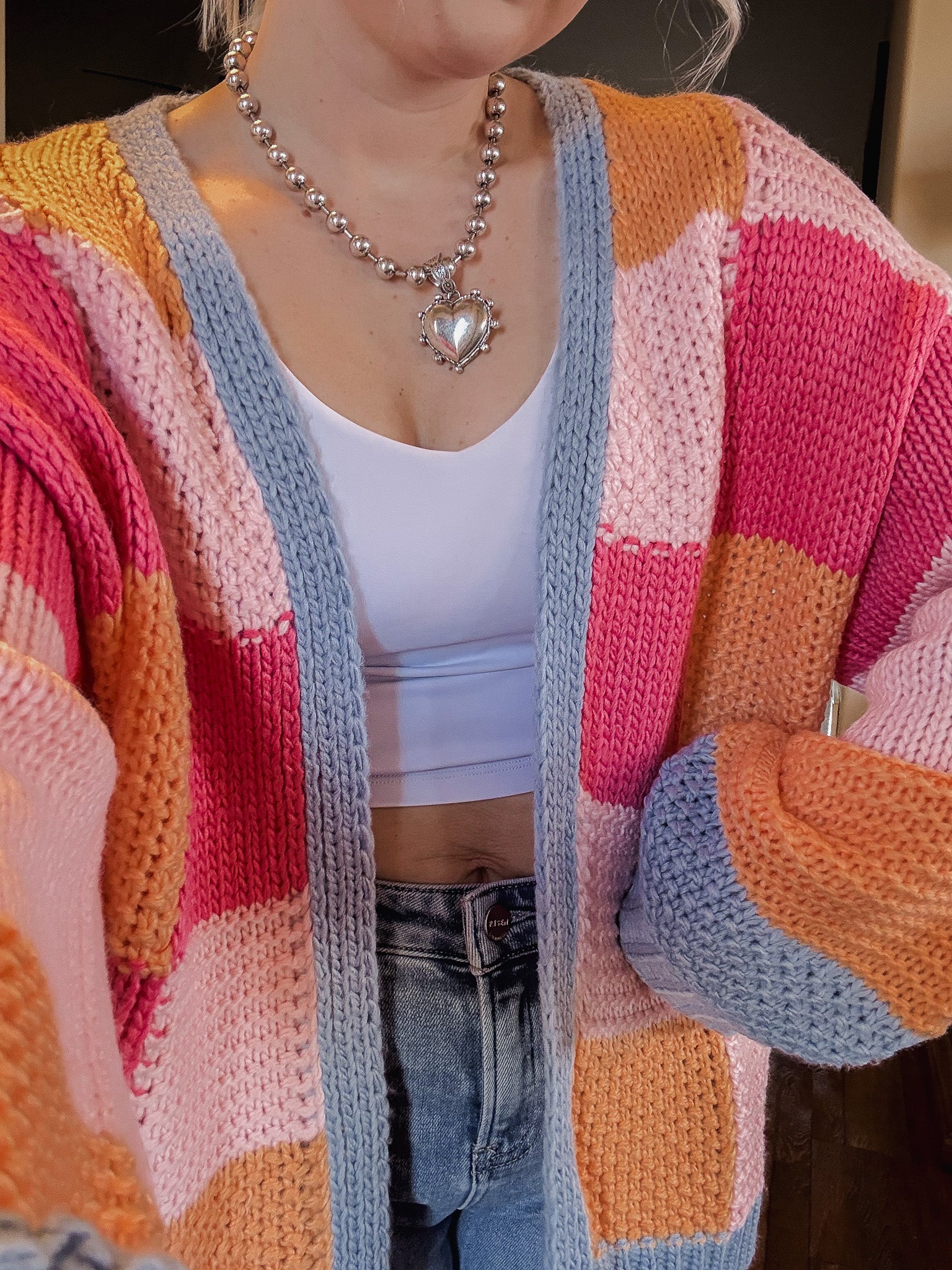 Manifest Spring weather with this bright, colorblock, quilted knit cardigan. So fun and cute to throw on with any outfit to add a little pop of color.