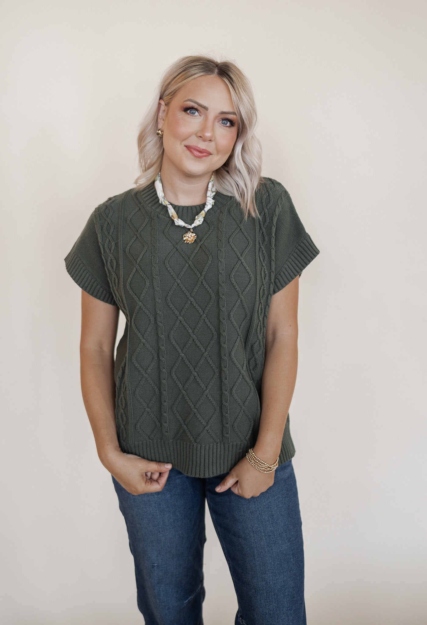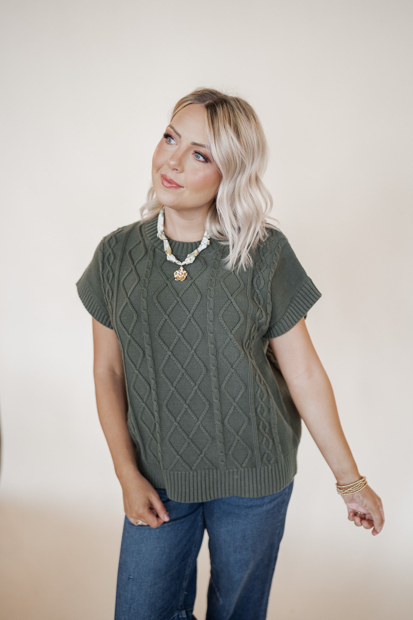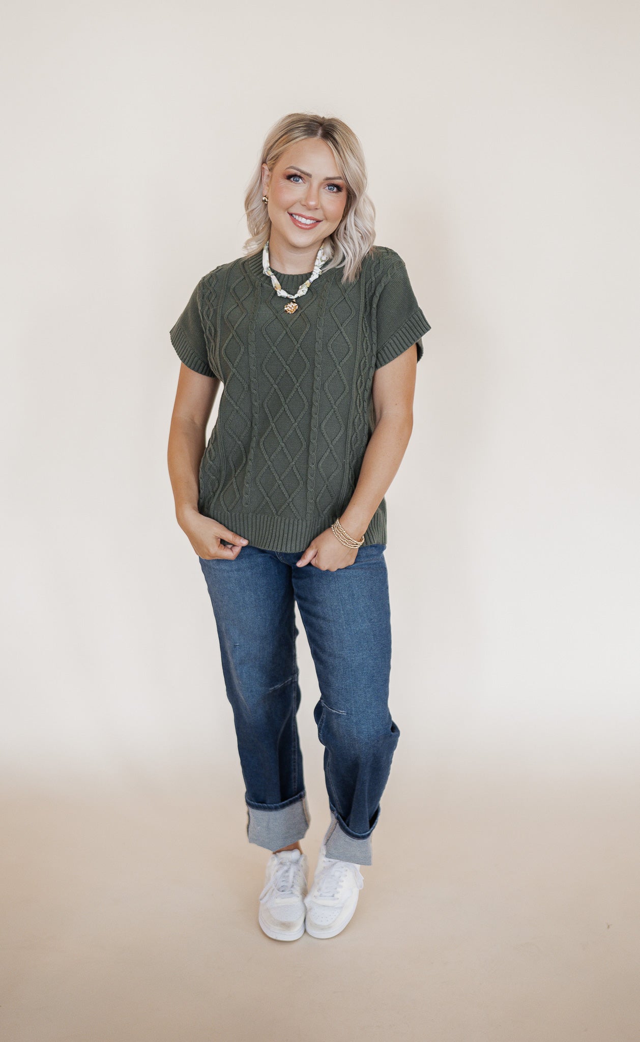Cable knit sweater in a beautiful olive color! Wear it by itself, or layer over a bodysuit or button down as the temps drop. A great transition sweater!