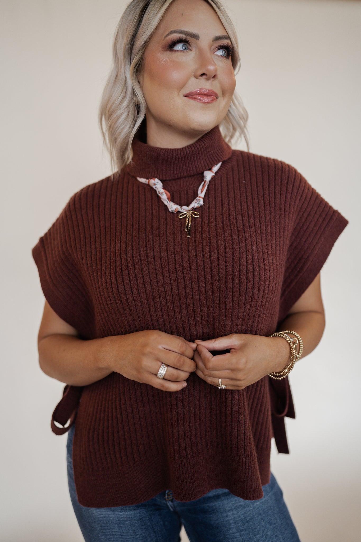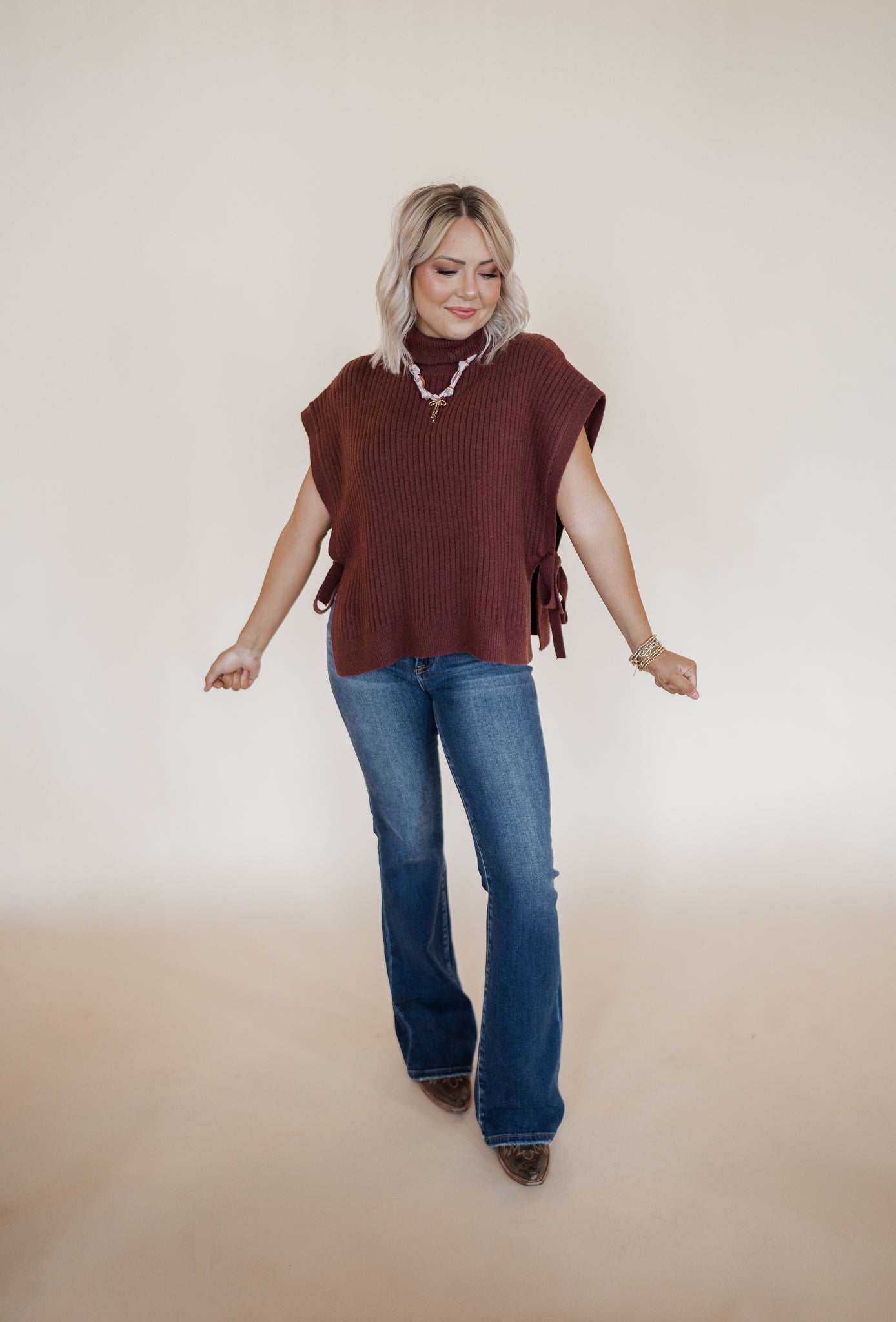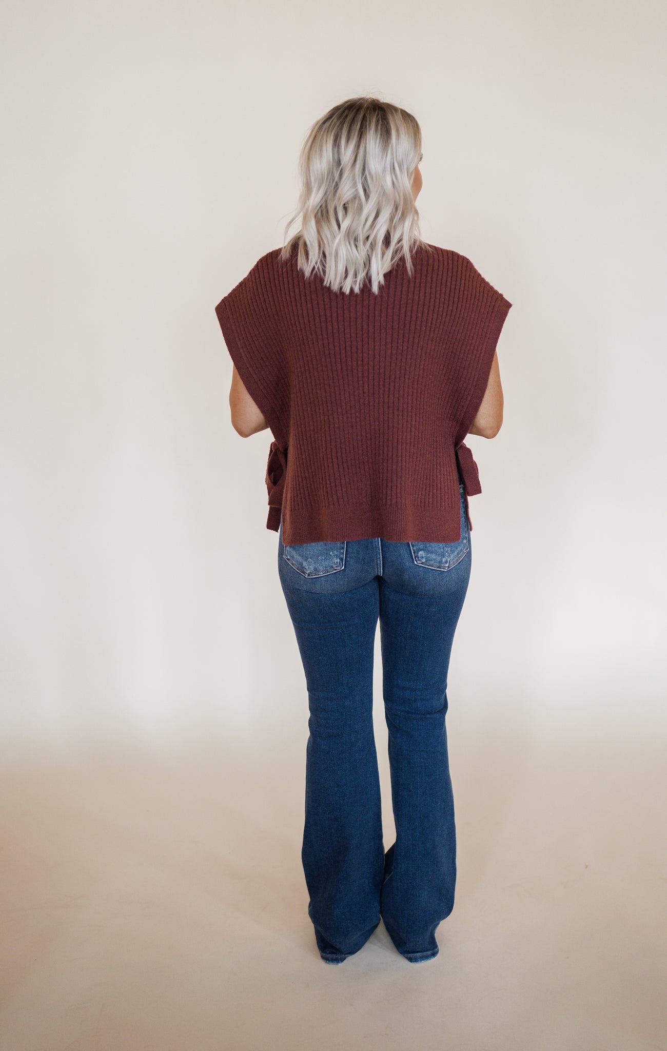Burgundy, ribbed, sleeveless turtleneck with side bow ties. Open sides - so this would be so cute layered over a long sleeve bodysuit for Winter!