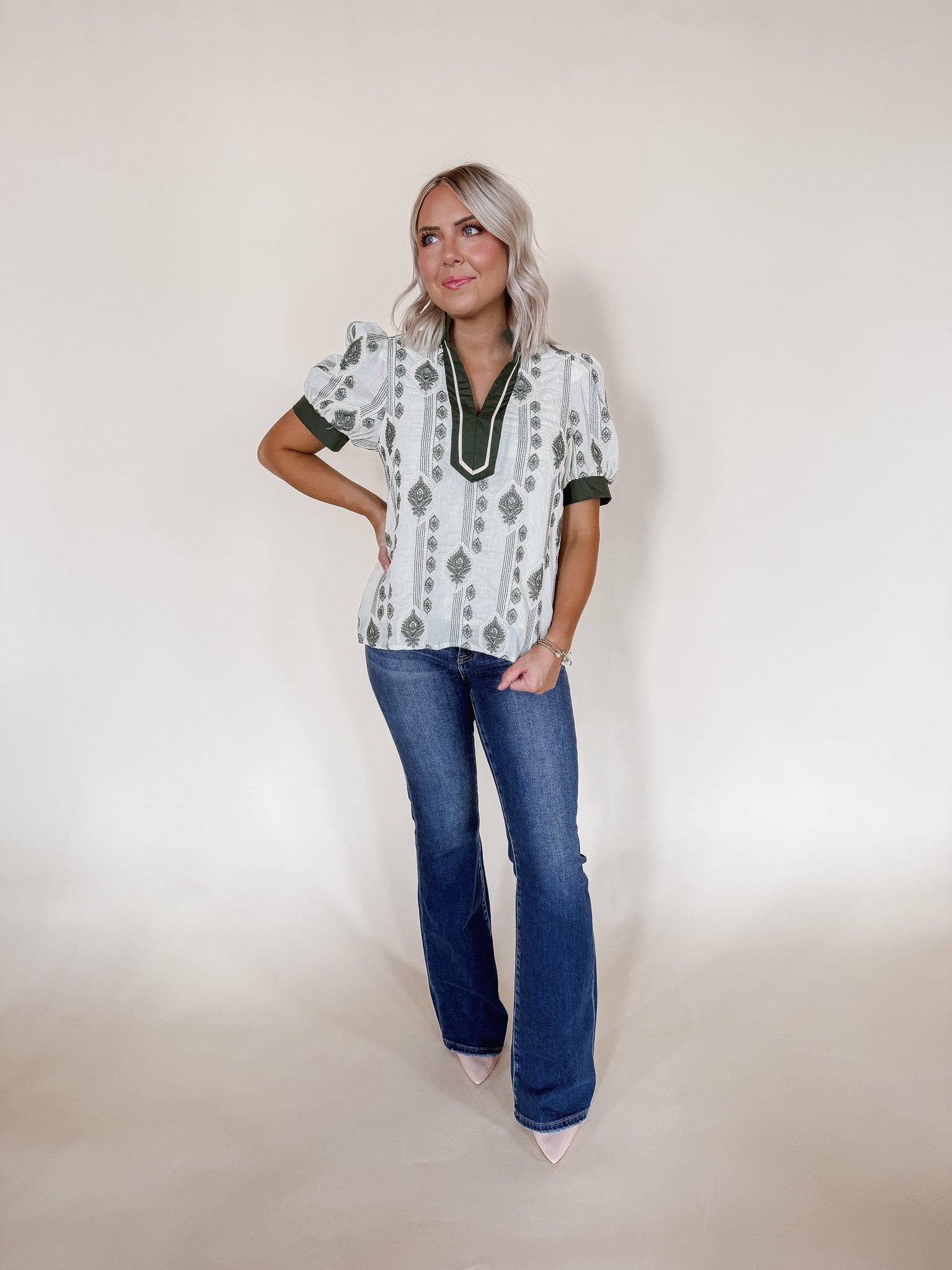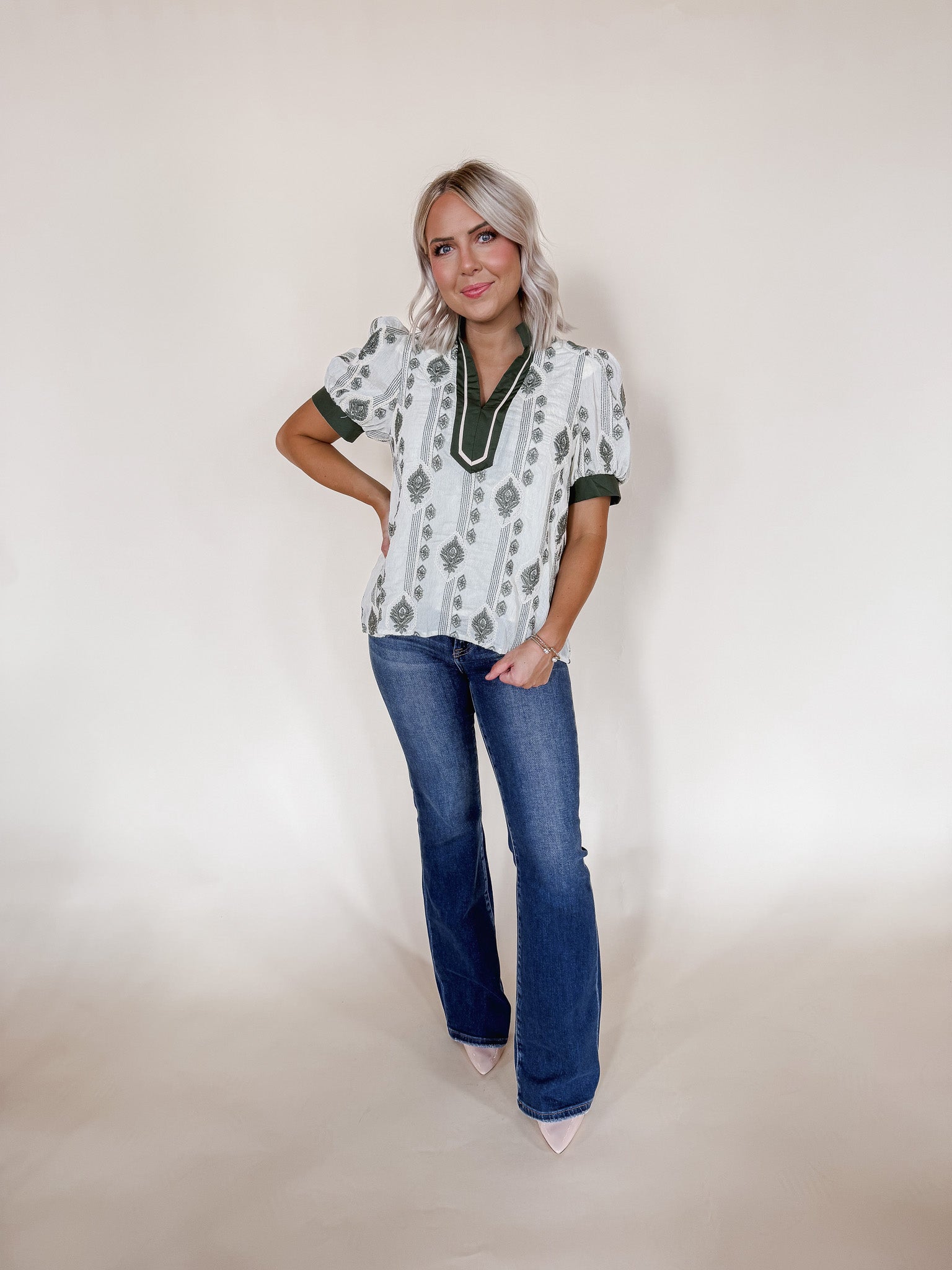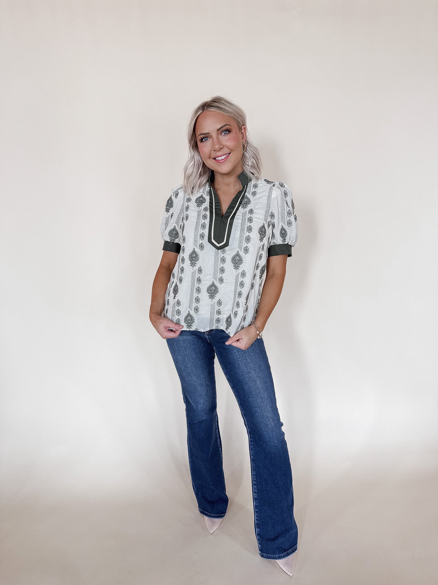 Ivory blouse with olive stitch and trim details. Mock neck collar, v neck, slight puff sleeve. Bands on the arms are NOT tight! Very comfortable fit. Lined.