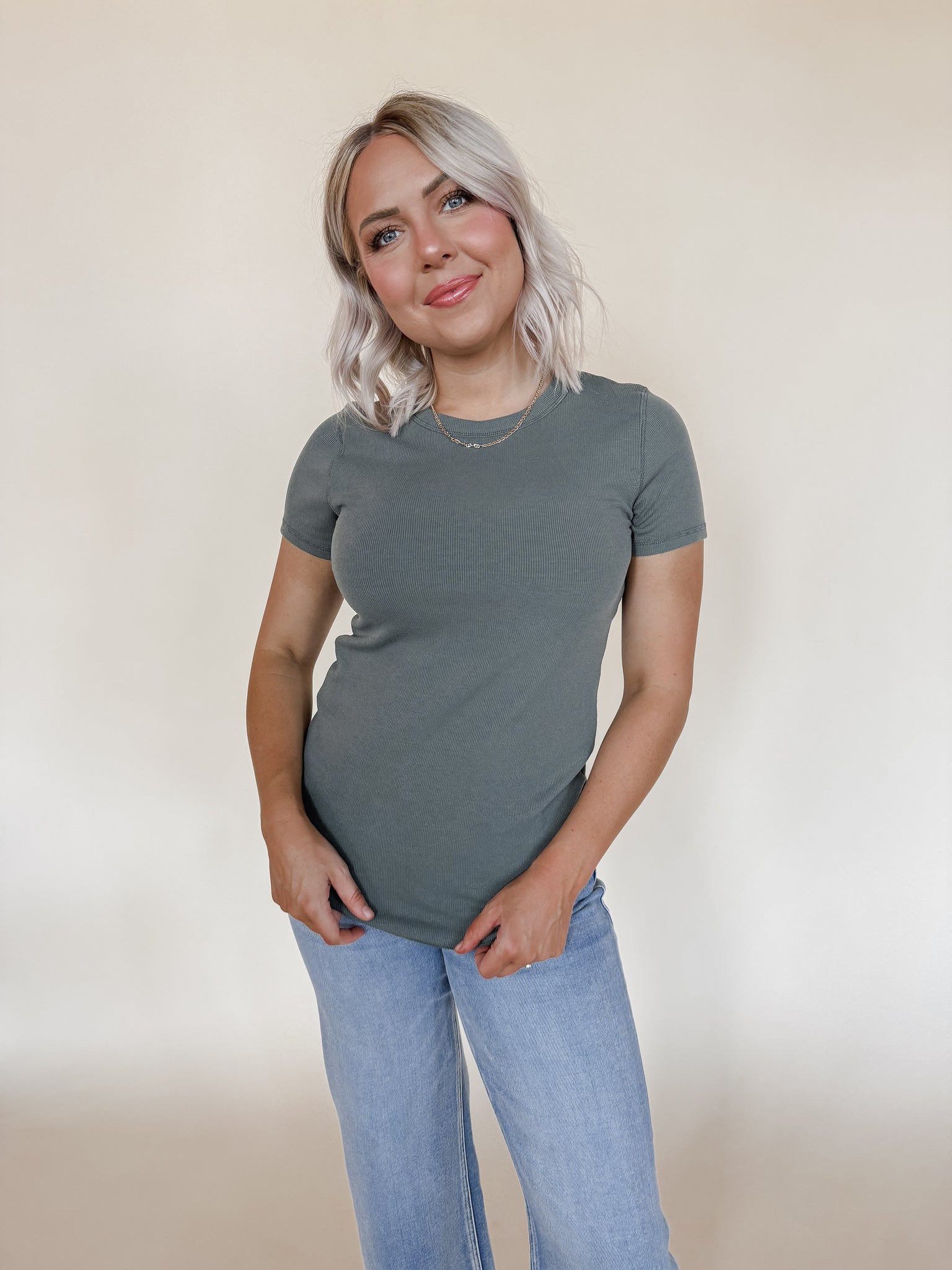 Ribbed knit basic tee shirt. SUPER soft! Scoop hem in front and back.
