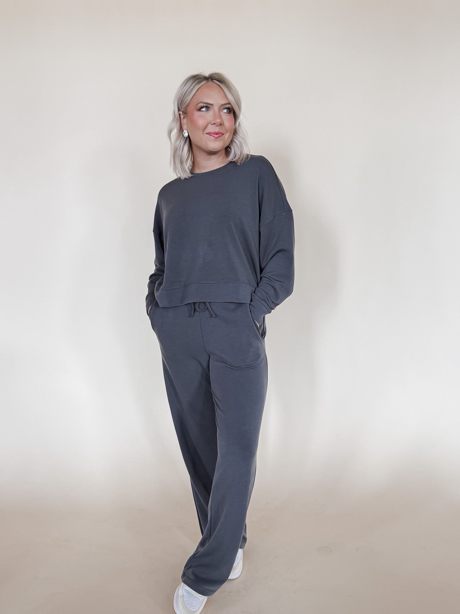 Meet your new favorite sweatshirt. Designed with a boxy-fit waistband for ultimate comfort, this sweatshirt feels as soft as butter and as light as a feather. The dropped shoulder design adds a touch of relaxed sophistication, making it perfect to pair with your favorite scuba pants or shorts. Elevate your casual wardrobe with this versatile piece that effortlessly combines style and coziness. Whether you're lounging at home or stepping out, this sweatshirt will be your go-to for a look that's put together yet undeniably comfortable.